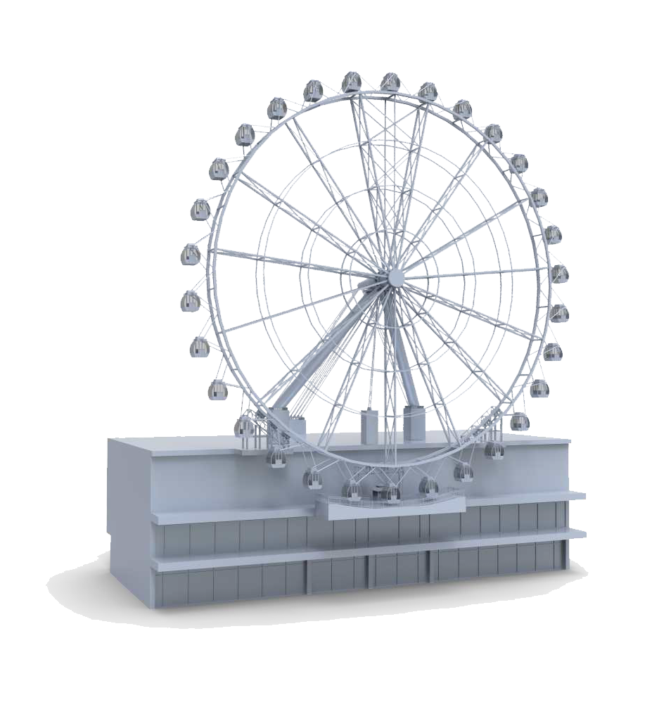 GLC-52A觀覽?,懸挑式?柱設計,如倫敦眼般彰顯“飄逸”個性。其懸挑式?柱設計尤為適合樓頂觀光,30個配備?全的吊廂使快速運營成為可能。