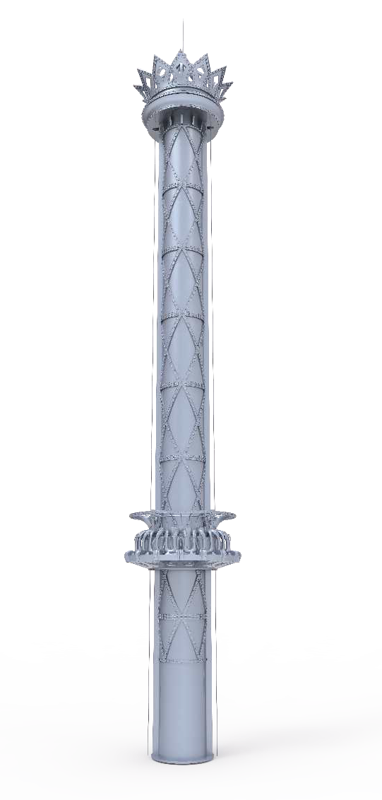 旋轉(zhuǎn)太空梭集傳統(tǒng)跳樓機豎直升降運動和旋轉(zhuǎn)運動于一身,運動方式多樣新穎,其簡形塔架可繞其自身下端轉(zhuǎn)動,滑行架跟隨塔架旋轉(zhuǎn)的同時支撐座椅沿塔架豎直軌道做升降運動。