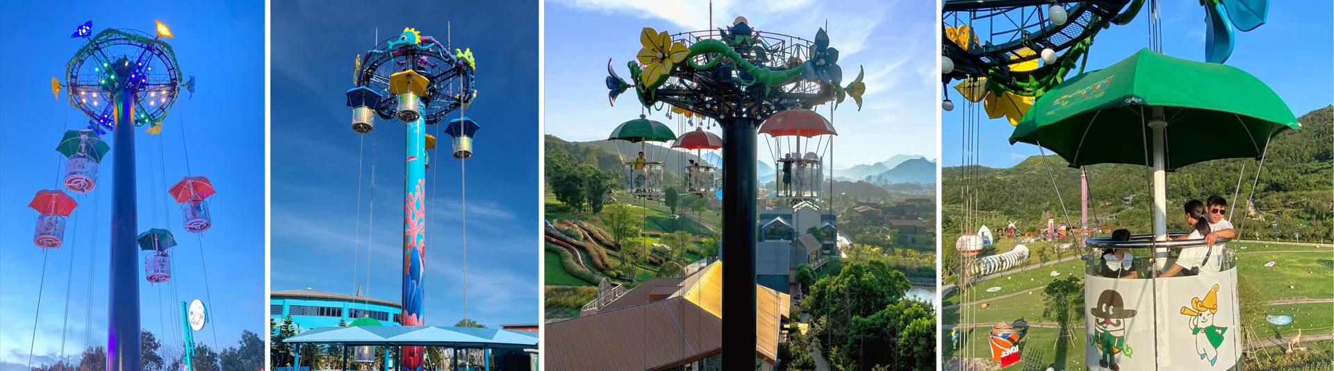 跳傘塔是一項(xiàng)使乘客吊籃沿豎直方向做上下往復(fù)運(yùn)動(dòng)的設(shè)備。外觀猶 如打開(kāi)的傘體,絢爛多彩,使乘客在吊籃內(nèi)愜意欣賞周邊風(fēng)景。