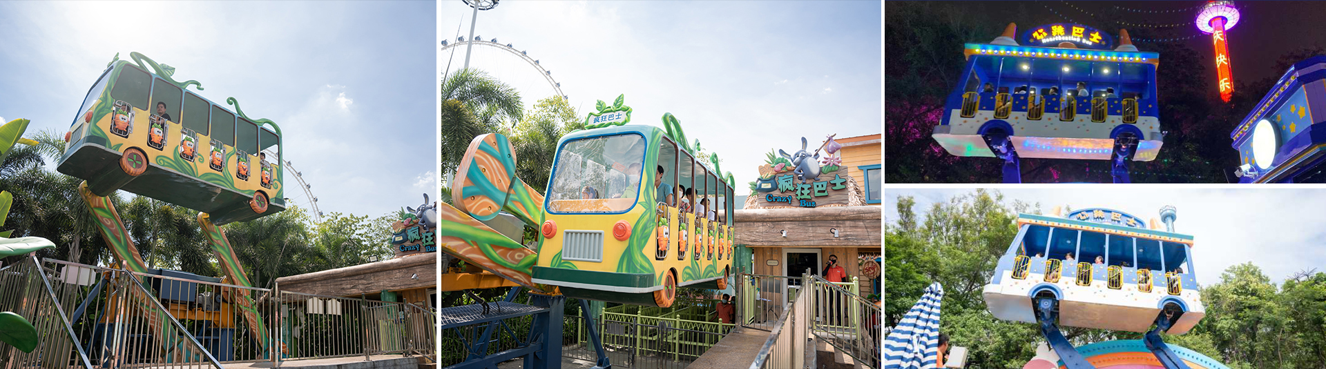 瘋狂巴士配備雙向可逆無級自動調(diào)速系統(tǒng),經(jīng)過減速、分速等一系列機構(gòu),實現(xiàn)一臺電機帶動兩個驅(qū)動臂的擺動,帶動巴士的平動,巴士在電氣系統(tǒng)的控制下可以實現(xiàn)正反兩種通過最高點的運動,給乘客以歡樂搖擺的體驗。