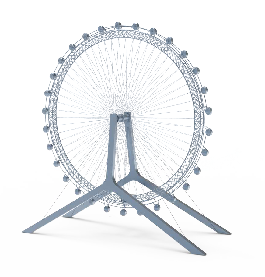 觀覽??架主??為?字形結構,轉盤為全纜索結構,由滾道和鋼纜組成。整體結構科學合理,外觀簡潔??,充滿了科技感與?量感。觀覽?設置了30個轎廂,每個可載客8?。為了增添游客的舒適度,轎廂還配備了空調(diào)系統(tǒng)、藍??響、?線對講機、氛圍燈及內(nèi)飾座椅,在保障安全性的前提下,更具現(xiàn)代感,也更加?性化。